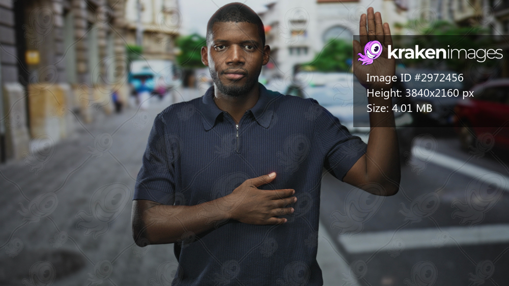 Man with raised right hand and left hand on chest on a city street crosswalk, wearing navy polo and slight smile amid cars and buildings; honor sincerity. - Kraken Images