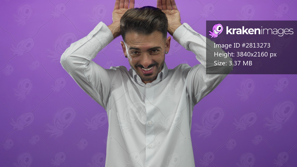 Man raises both hands behind ears in studio with purple backdrop exposing bare wrists and cheeks in a playful gesture; playfulness joy mischief fun.