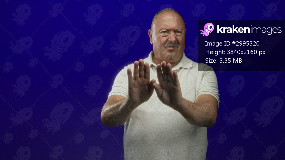 Man raises both hands palms out in a studio, bare forearms visible, wearing a white polo, grimacing in a stop gesture captured across a six frame sequence; rejection boundary. - Kraken Images