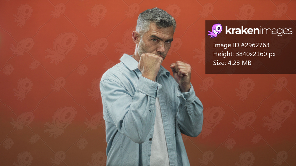 Man raises fists in a boxing stance, fist visible and casual denim shirt in studio red backdrop; determination concentration.