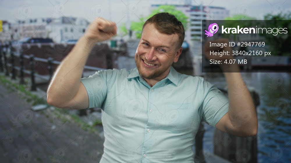 Man raises fists on an amsterdam street showing bare forearms and clenched hands while smiling broadly; celebration joy.