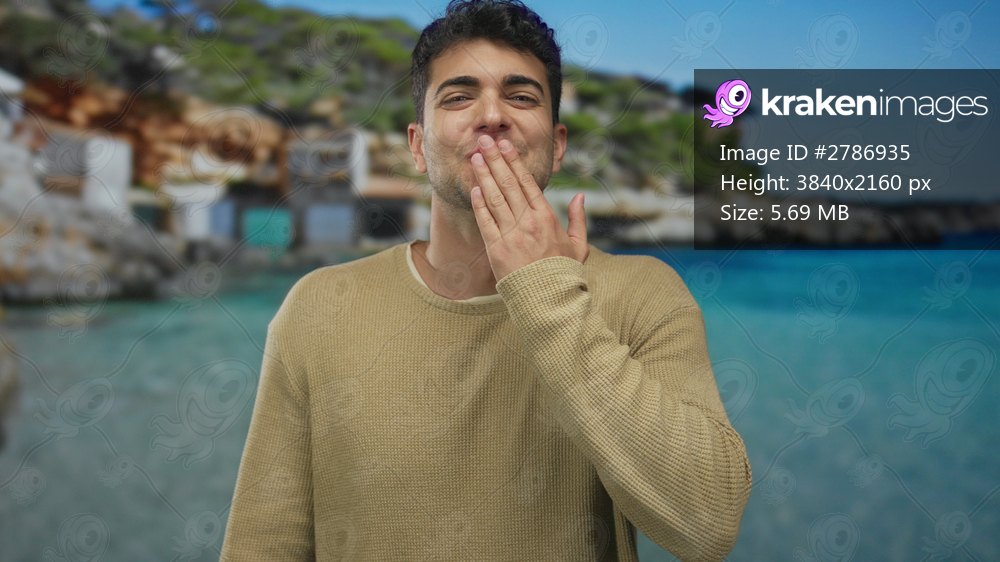Man raises hand and blows gently toward camera in outdoor setting with young hispanic guy planting kiss on lips before a radiant smile.