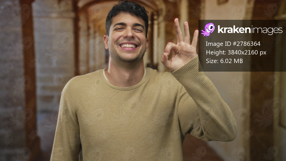 Man raises hand in an ok gesture inside a hallway while young hispanic male shows a bright smile in a portrait.