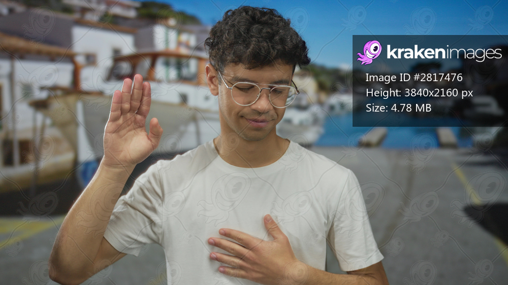 Man raises hand to wave by a building and smiles softly while the other hand rests on chest; sincerity.