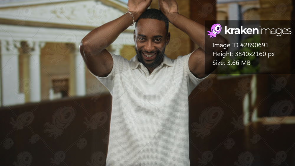 Man raises hands above head showing forearms and smile, wearing white polo, facing camera on old town building balcony with classical columns; confidence. - Kraken Images