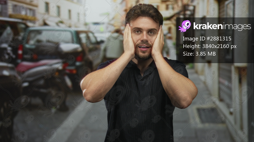 Man raises hands beside face on a crowded city street, mouth open and palms visible in a shock gesture; surprise curiosity.