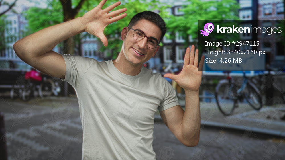 Man raises hands framing face in a friendly pose on a city street with bicycles and canal buildings visible; playful casual greeting.