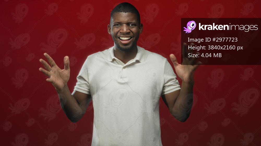 Man raises hands palms open and smiles in studio against a solid red backdrop, shifting from guarded fists to open palms across shots; joyful playfulness. - Kraken Images