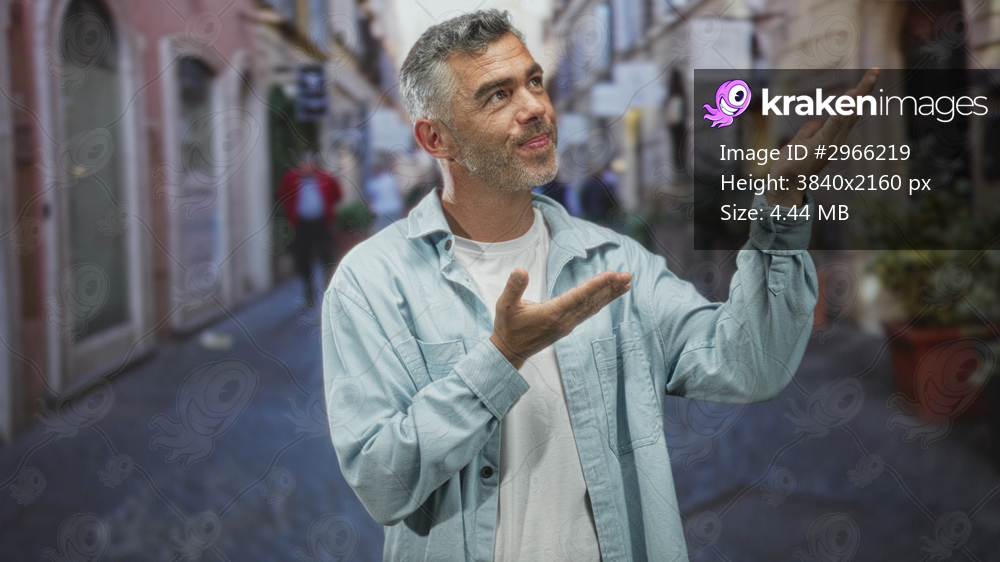 Man raises hands palms up presenting on a cobblestone street with shopfronts and a potted plant; friendly welcome.