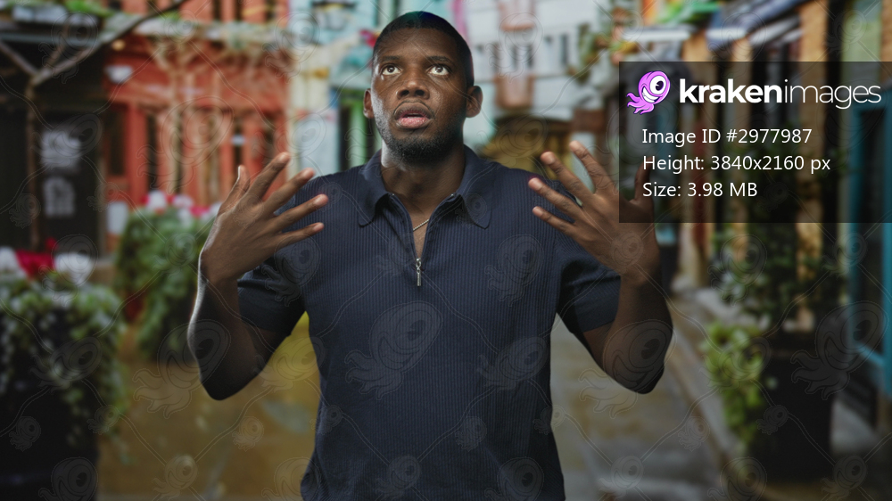 Man raises open hands near face while gazing upward on street with shopfronts and potted plants; contemplation.