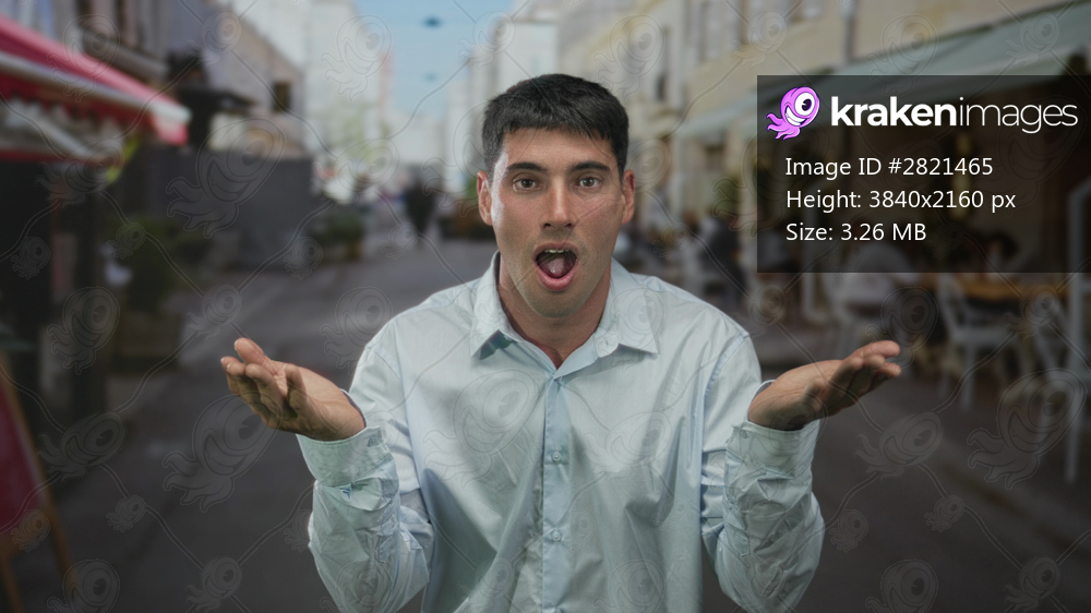 Man raises open palms with shrugged shoulders on street terrace outside restaurant under awning with tables and chairs; surprise.