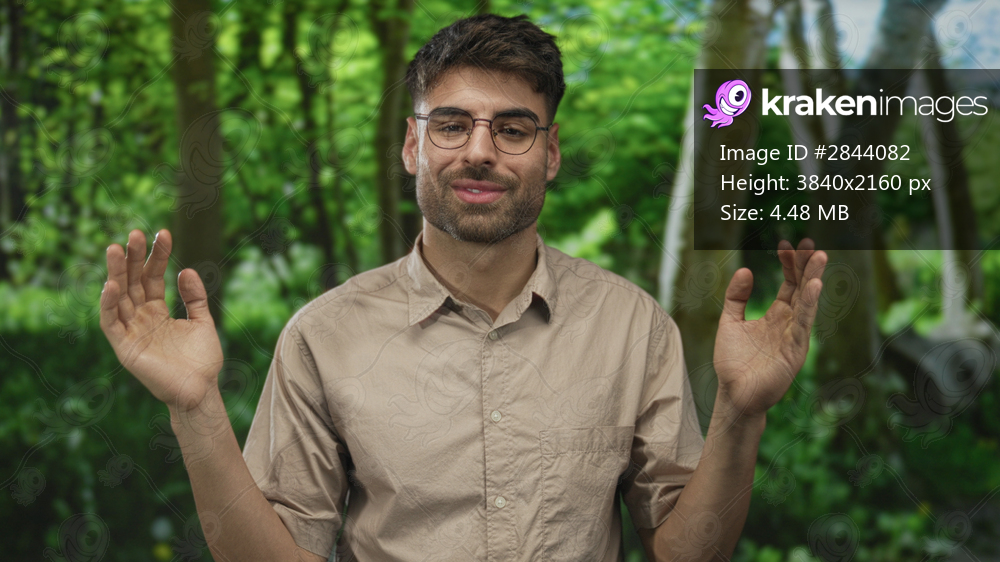 Man raises palms while standing in forest with green foliage behind and wearing glasses and beige shirt; serenity.