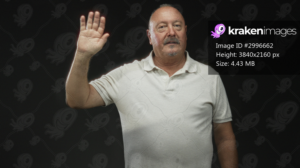 Man raises right hand showing palm to camera in studio wearing white polo shirt; calm acknowledgment.