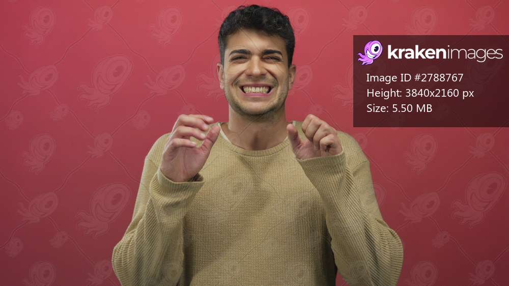 Man raises shoulders and pulls sweater against the background while hispanic young red male looks nervous from jittery anxiety.