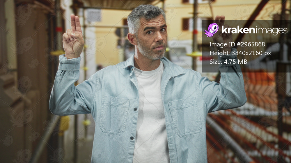 Man raises two fingers on each hand in a street beside scaffolding and a building facade, wearing a denim jacket and white tshirt; playful confidence.