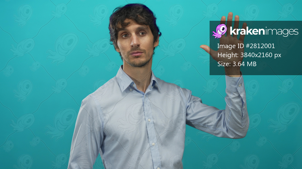 Man raising bare hand against a blue studio wall, wearing a light blue shirt and showing a palm gesture in portrait shot; greeting.