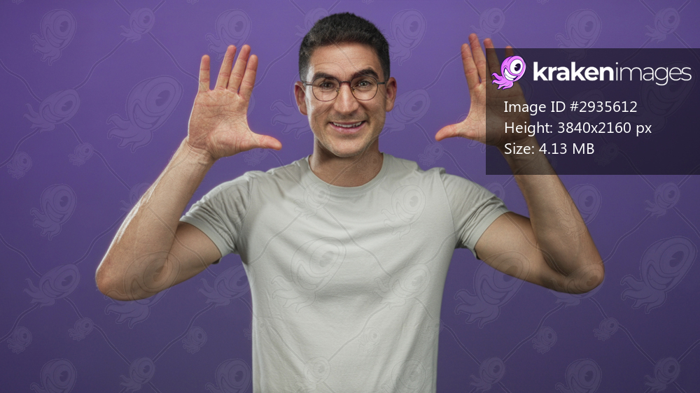 Man raising both hands with palms facing forward wearing glasses and light gray t shirt in purple studio backdrop; playful confidence.