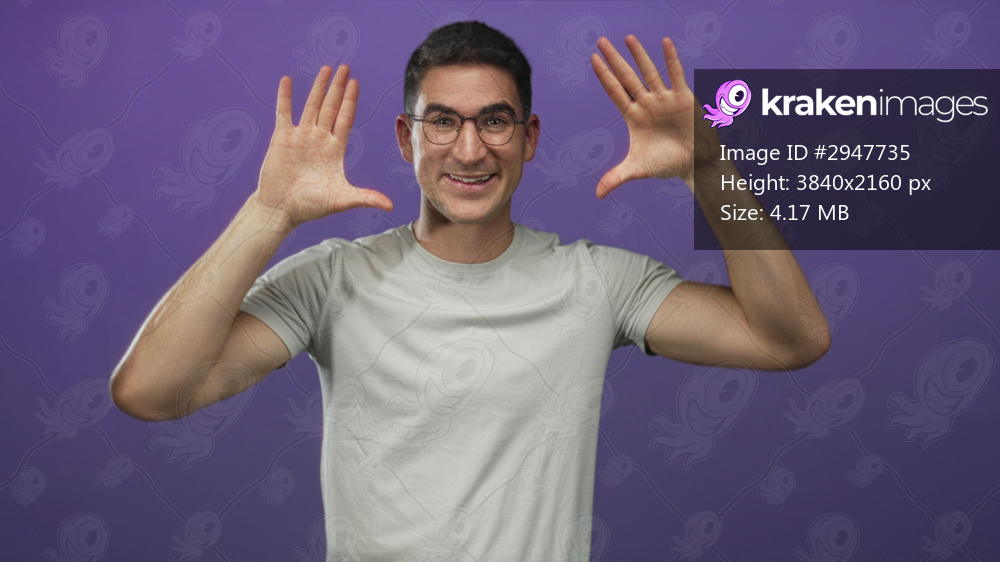 Man raising both hands with palms facing forward wearing glasses and light gray t shirt in purple studio backdrop; playful confidence.