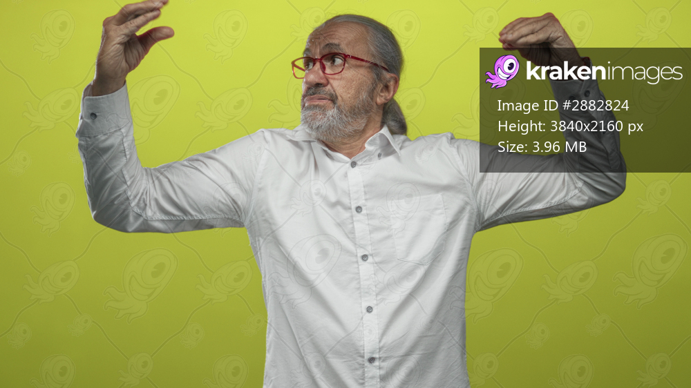 Man raising both hands with palms visible in studio with lime green backdrop, wearing white shirt and red glasses; contemplation.