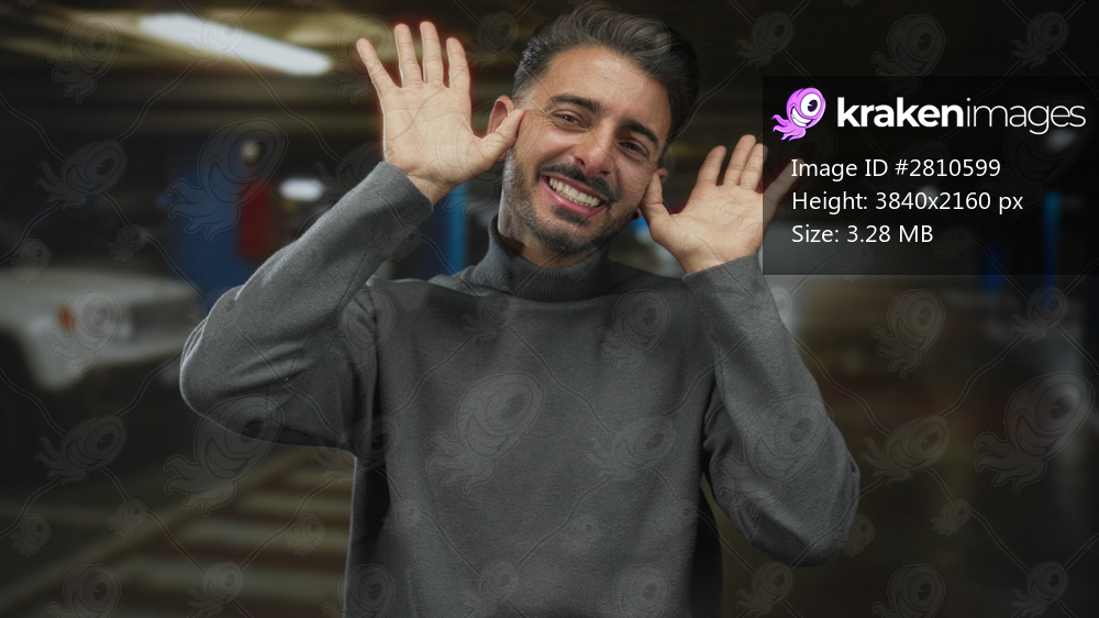 Man raising both hands to ears in a dimly lit parking garage smiling broadly with playful expression; playfulness.