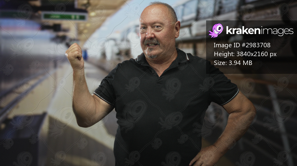 Man raising clenched fist and hand on hip inside a station building near a train platform, wearing black polo with bare forearm visible; confidence resilience. - Kraken Images