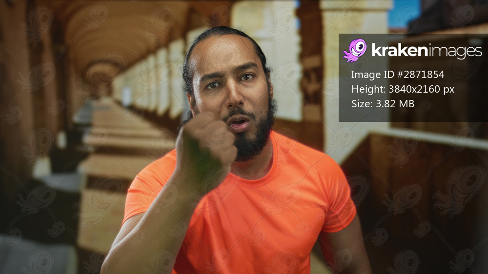 Man raising clenched fist toward camera on old town stone street with colonnade building, speaking firmly; defiance resilience.