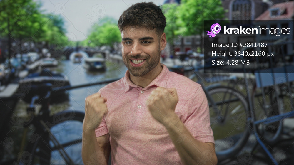 Man raising clenched fists and smiling by canal on street amid bicycles and buildings; joy victory celebration.