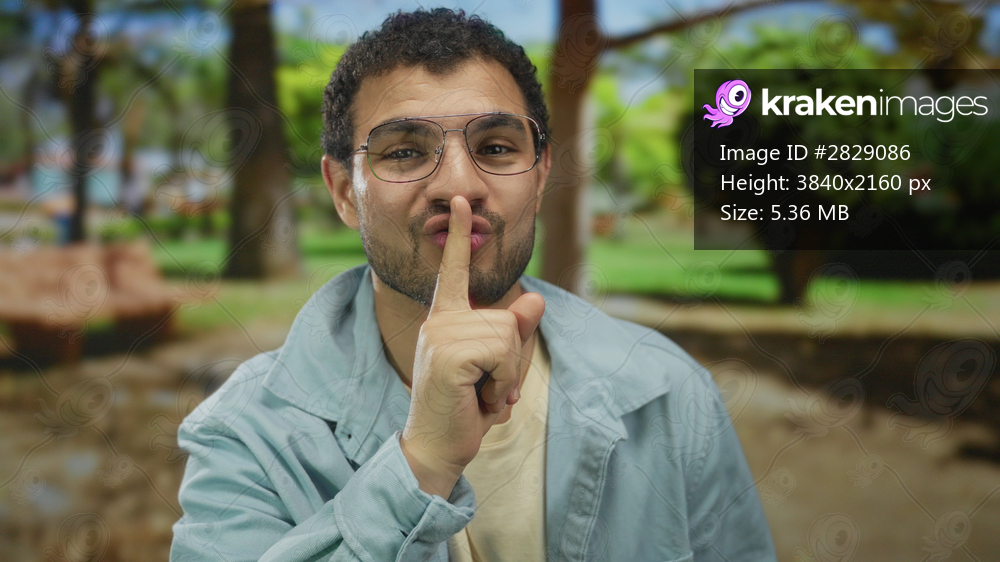 Man raising finger to lips for silence in a sunny green park with trees and bench in focus; silence.