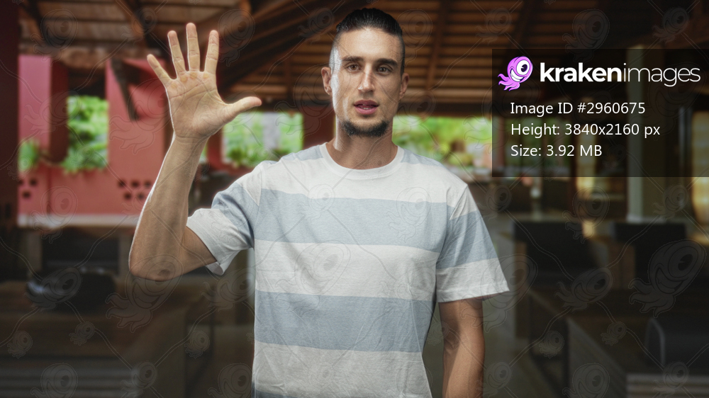 Man raising fist and waving open hand in a building, wearing striped tshirt and goatee while pointing finger; confidence greeting.