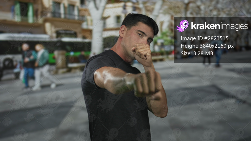 Man raising fists and punching forward on a busy street lined with blurred buildings and pedestrians; determination.