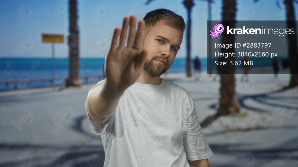 Man raising hand with palm facing camera in a stop gesture on a street promenade by the seaside in casual white t shirt; defiance.
