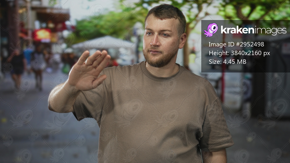 Man raising hand with palm up in stop gesture on a busy street, wearing a brown t shirt and short beard; determination.