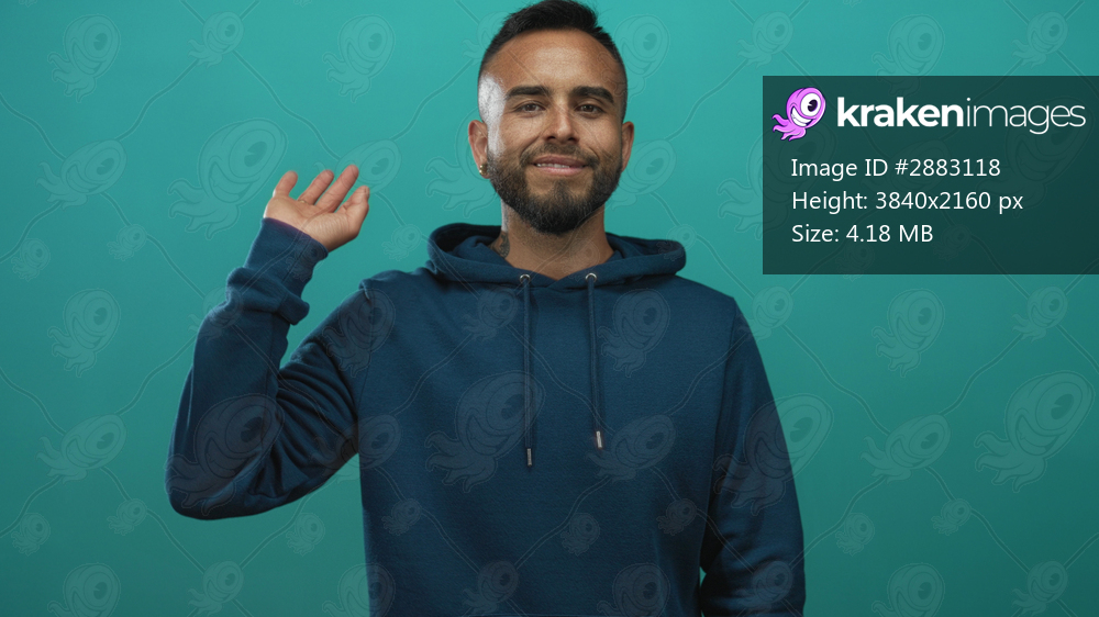 Man raising hand to form ok sign with visible palm and fingers in studio against teal background; approval.