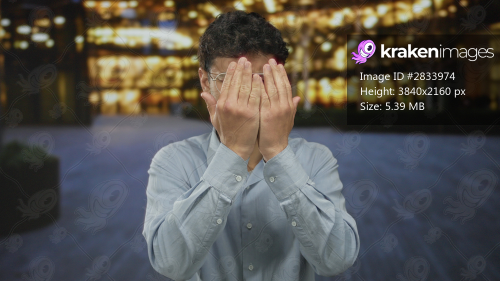 Man raising hands with palms forward on street lit by building windows at night in city scene; surprise.