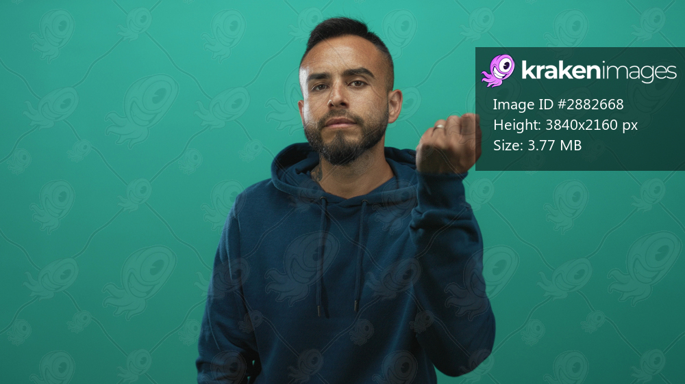 Man raising his fist in studio against a teal wall wearing a navy hoodie and visible beard; defiance doubt.
