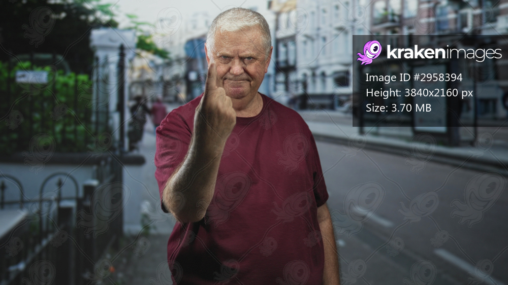 Man raising middle finger with exposed hand and stern expression on a city street near a bus stop and wrought iron fence, facing camera; defiance.