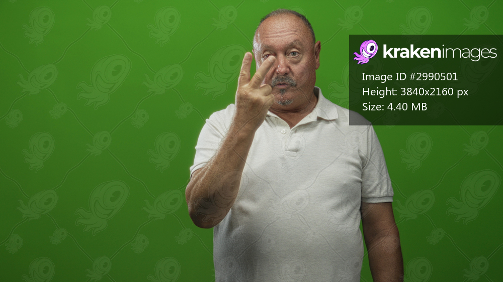 Man raising right hand and counting fingers in front of green screen studio, looking to the side with expressive gesture; thoughtful reflection.