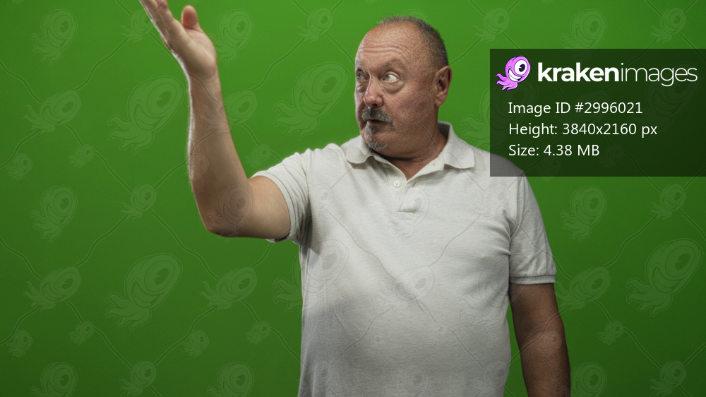 Man raising right hand and counting fingers in front of green screen studio, looking to the side with expressive gesture; thoughtful reflection.