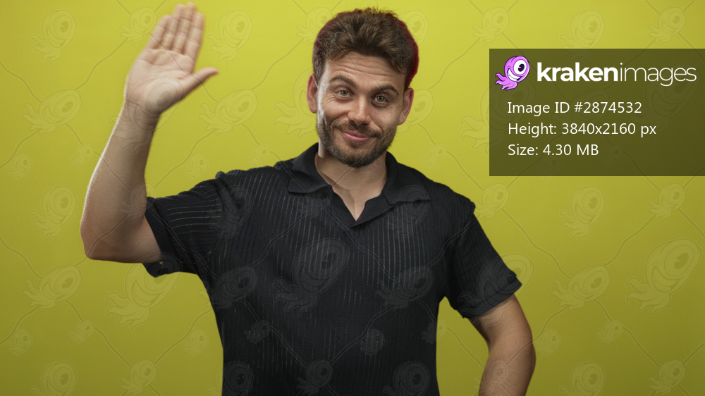 Man raising right palm clearly visible against bright yellow studio wall, wearing black polo shirt with casual stance and slight smile; friendly greeting. - Kraken Images