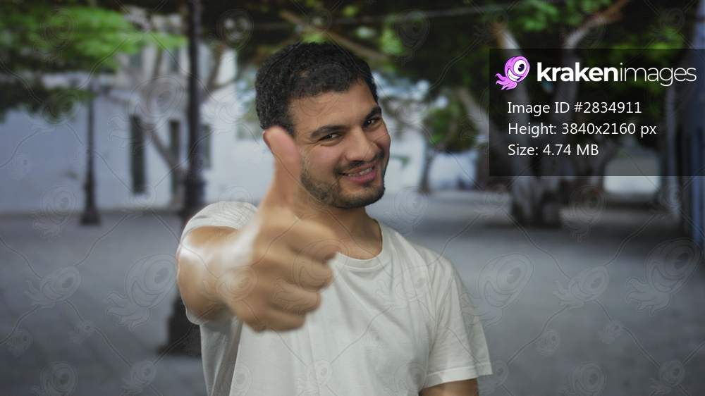 Man raising thumbs up gesture in street scene with blurred trees and lamppost visible behind him; optimism and encouragement.
