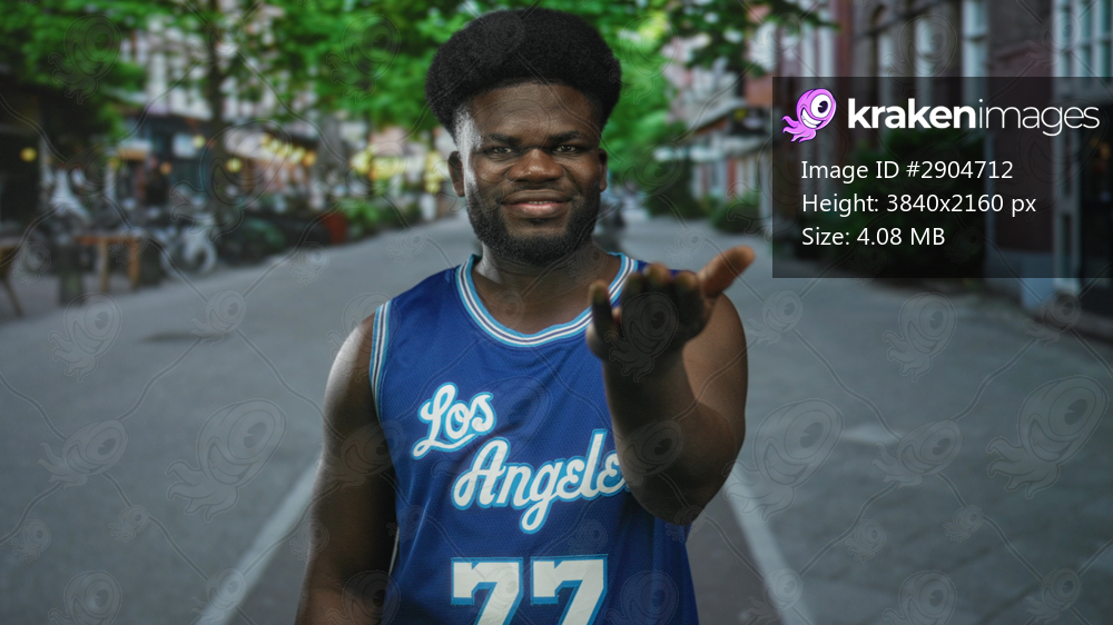 Man reaches hand palm up on city street wearing blue basketball jersey; inviting outreach connection community.
