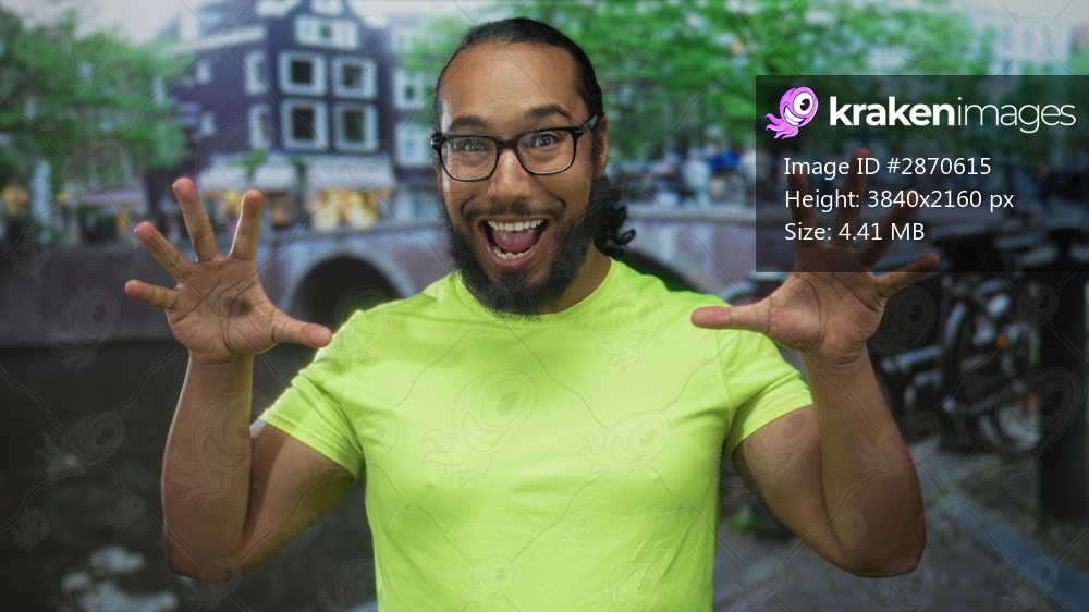 Man reaching hands forward with fingers spread on a street in amsterdam canal area with bicycles and bridge; playful.