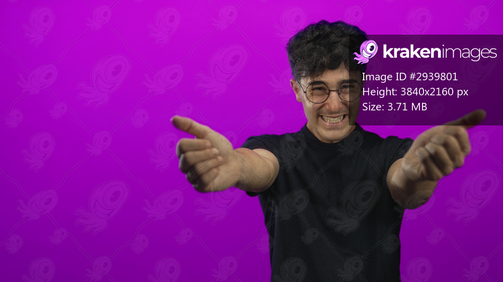 Man reaching hands forward in magenta studio with arms extended toward camera, wearing black t shirt and round glasses, grinning broadly; joy energy.