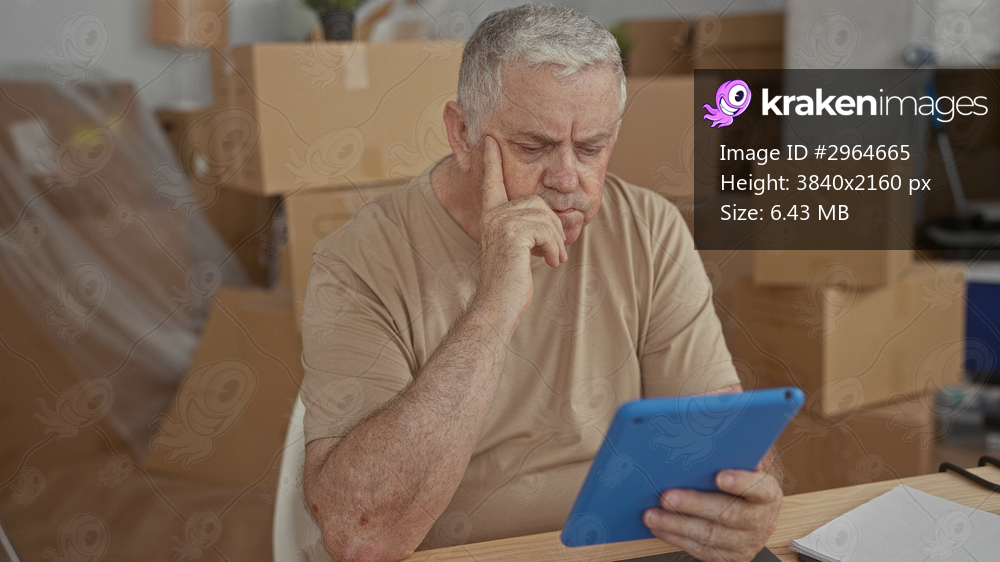 Man reading a blue tablet with finger on chin, seated among stacked moving boxes in a building; concern planning.