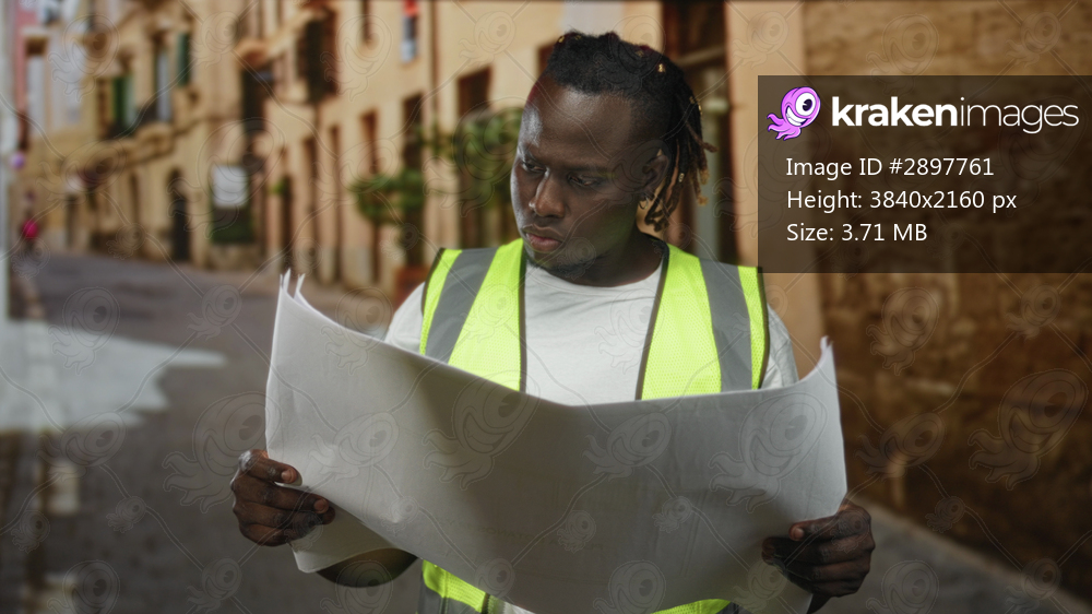 Man reading a large blueprint while wearing a reflective vest on a street in an old town; focused concentration.