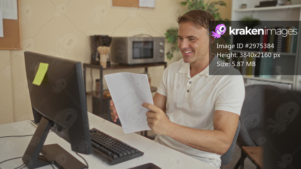 Man reading document with hand holding pages and raised fist at desk beside computer in building; satisfaction achievement.