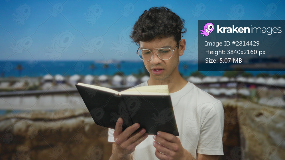 Man reading hardcover book by railing at port under bright sunlight with focused gaze over sea horizon; concentration.