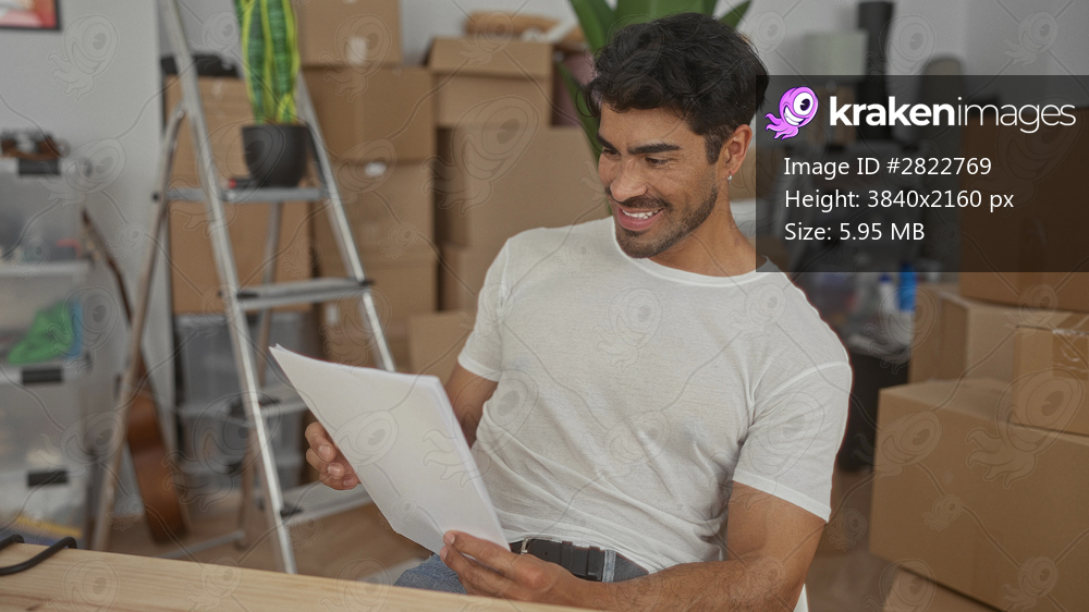 Man reading moving papers with hand among unpacked boxes in building wearing white shirt; moving excitement.