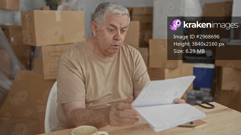 Man reading paperwork, rubbing eye at table with mug and smartphone amid stacked moving boxes, building; concern bills.
