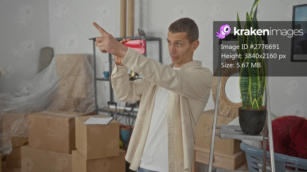 Man recording video with smartphone in living room surrounded by moving boxes and houseplants, creating a personal vlog in his new home reflecting a fresh start and creativity. - Kraken Images